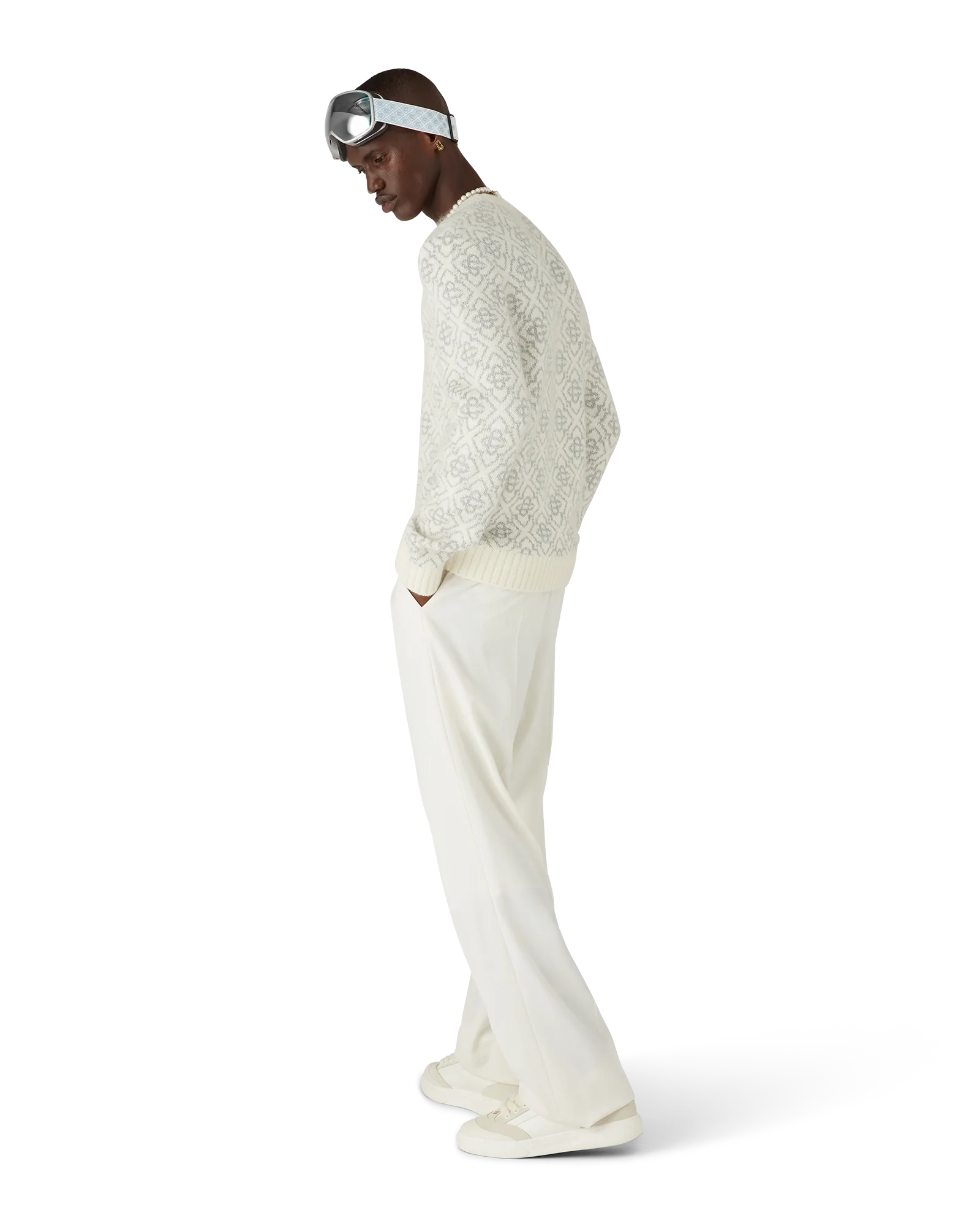The ski jumper is a refined après-sport design from mohair fabric featuring the house's white and grey monogram motif, inspired by frost patterns on traditional Japanese farmhouse windows. Drawing from snow crystals on bamboo groves, the design blends sport-leisure elegance with alpine functionality. Completed with a rib knit crew neck and hem.