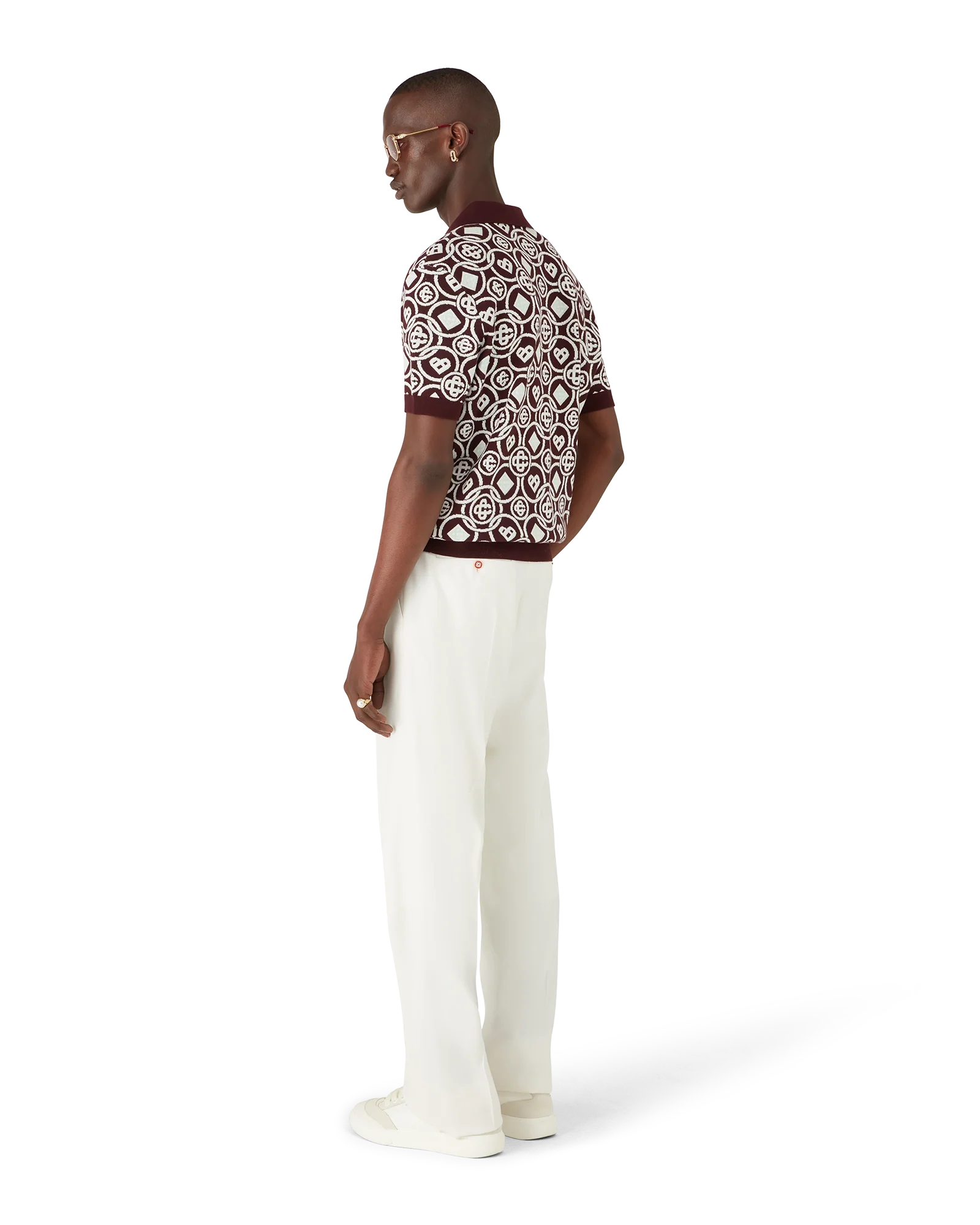 The monogram cotton knit polo shirt is a short-sleeve design featuring the season's new Honeydrew logo repeat - this repeat differs from our other monograms, as it combines unique shapes to form a cohesive pattern. It is more of an icon-based design. Completed with button closure, signature gold rim pearl buttons, and a rib collar, cuffs, and hem detail.