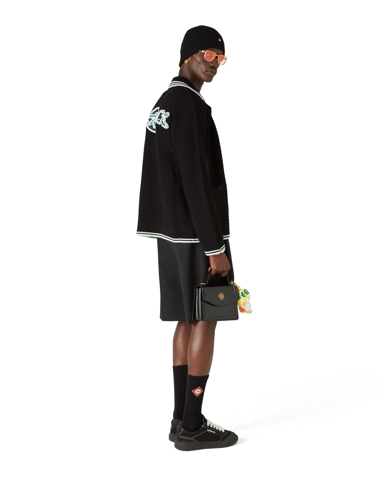 The embroidered cotton crochet long-sleeved shirt is a classic design featuring the house's signature diamond logo, tying back to the capsule’s travel and vacation theme. Completed with a rib collar, cuffs, hem and placket, front patch pockets, button closure, signature gold rim pearl buttons, and black, mint, and white stripe edge detail on the cuffs, hem and collar.