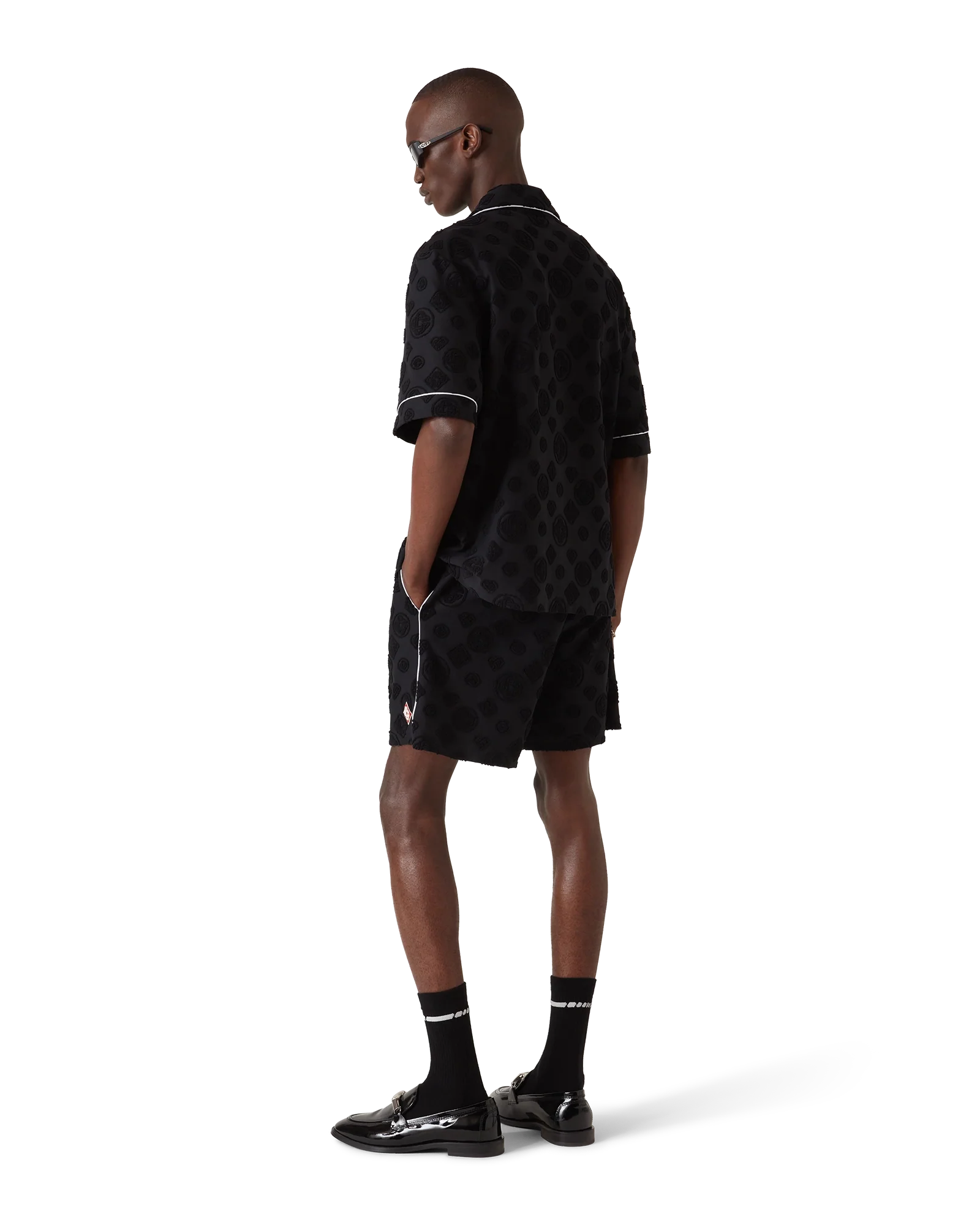 The towelling monogram shorts are a refined design featuring the house's Icon Monogram print. Completed with an elasticised waistband, gold-tipped drawstring fastening, pin tuck seams down the front, a back pocket, slanted side pockets, and piping details on the back and front pockets and down the sides.