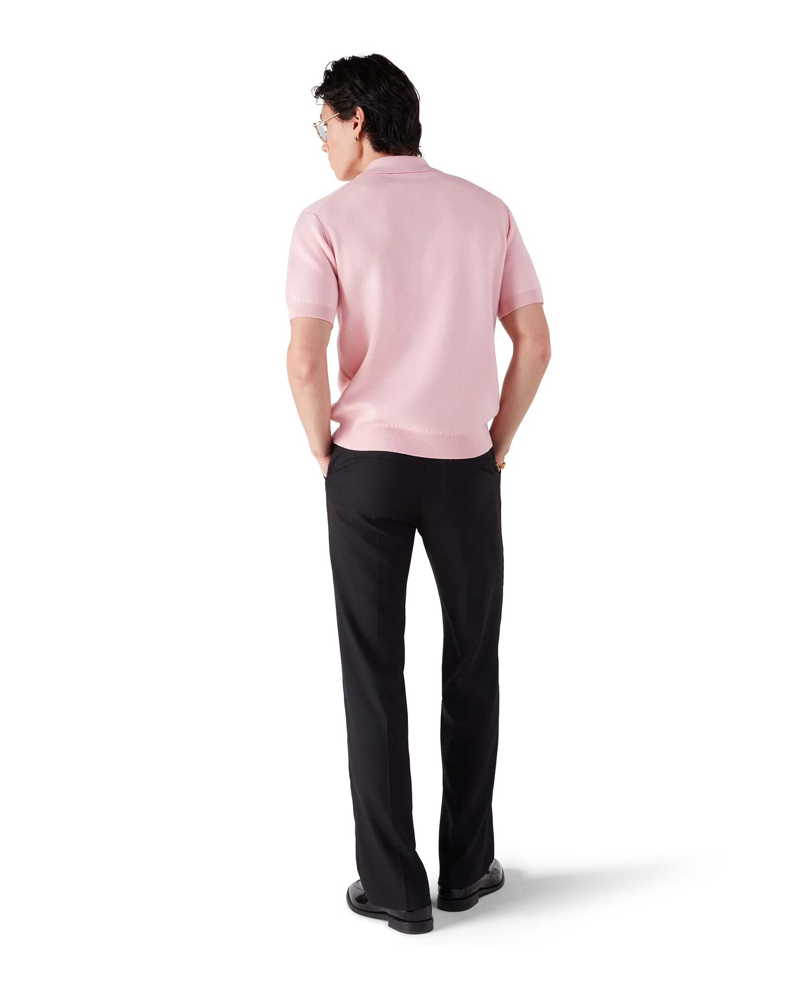 The merino knit short-sleeve polo shirt is a classic design featuring the house's Casablanca logo. Completed with a three-button placket, signature gold rim pearl buttons, and ribbed collar, cuffs, and hem detail.
