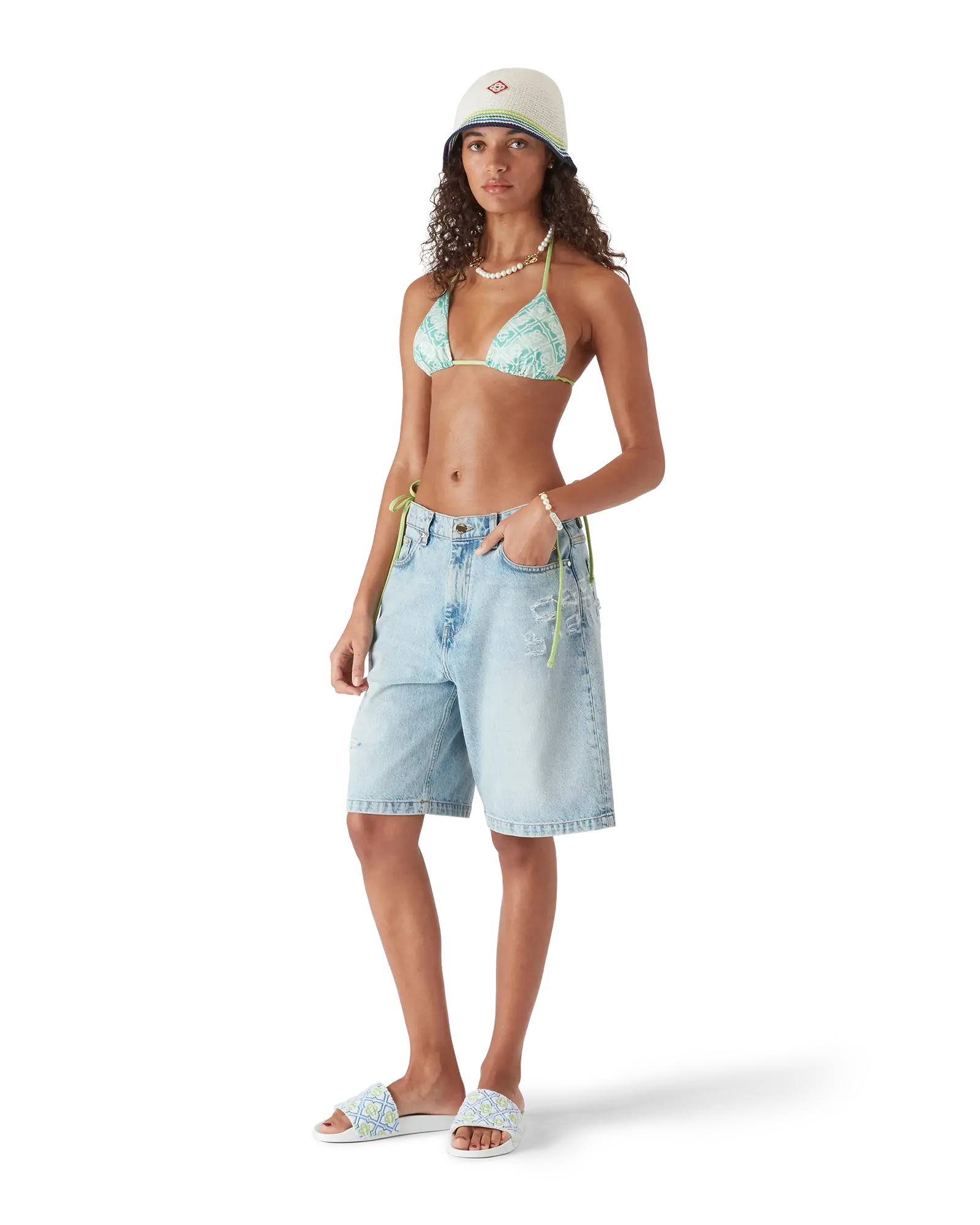 The Wavy Monogram string triangle bikini top is a refined design featuring the house's monogram pattern on a Memphis-wave inspired background. Completed with gold-tipped string fastening , removable cup support, and the house's signature gold-plated interlocking CC rivet on the left cup - this piece is designed to be worn with its matching bikini bottom.