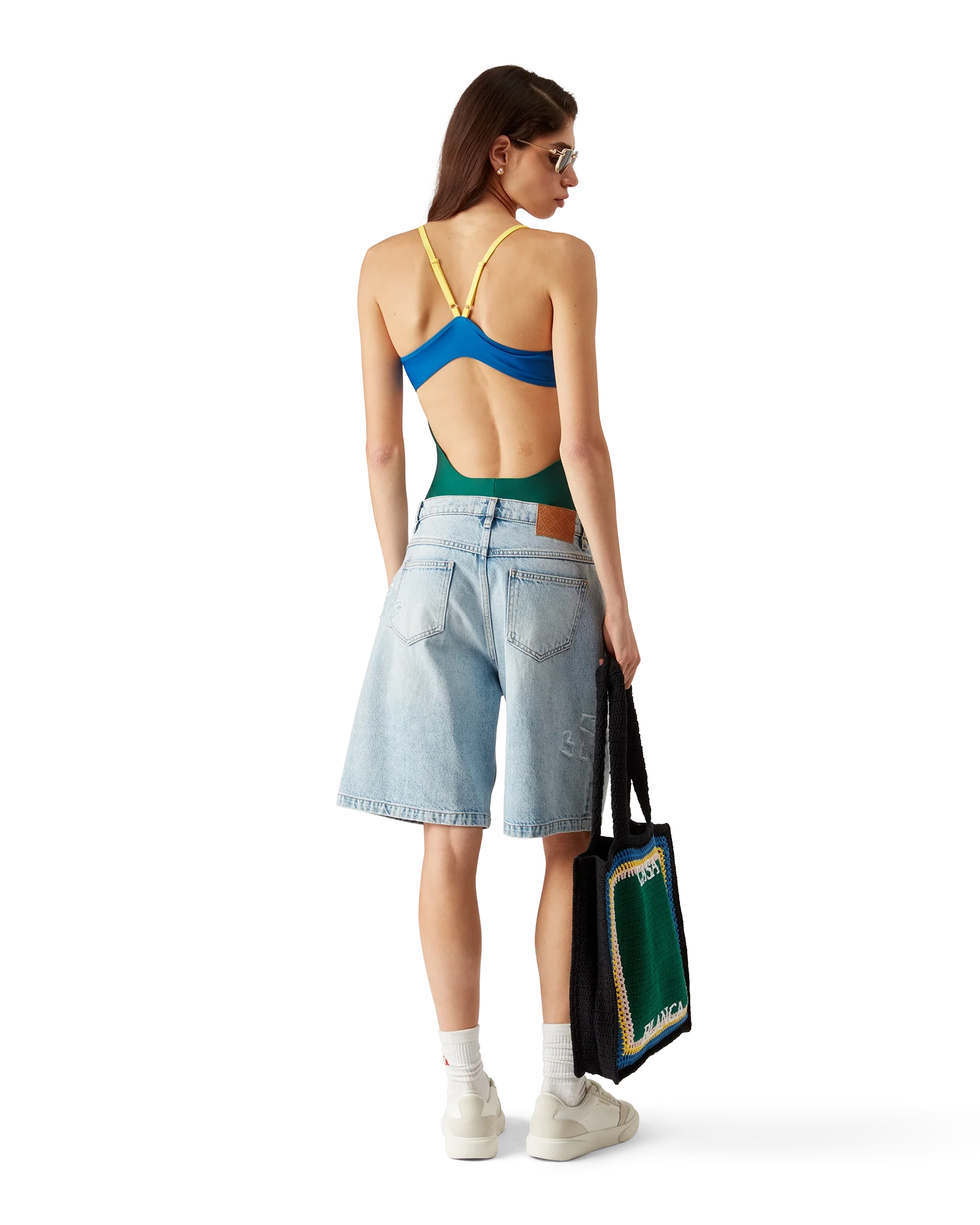 The colourblock swimsuit is crafted from a breathable technical swim fabric, featuring the house's Casablanca logo on the chest. Completed with contrast trims, high-cut legs, a scoop neck, and a cut-out back.