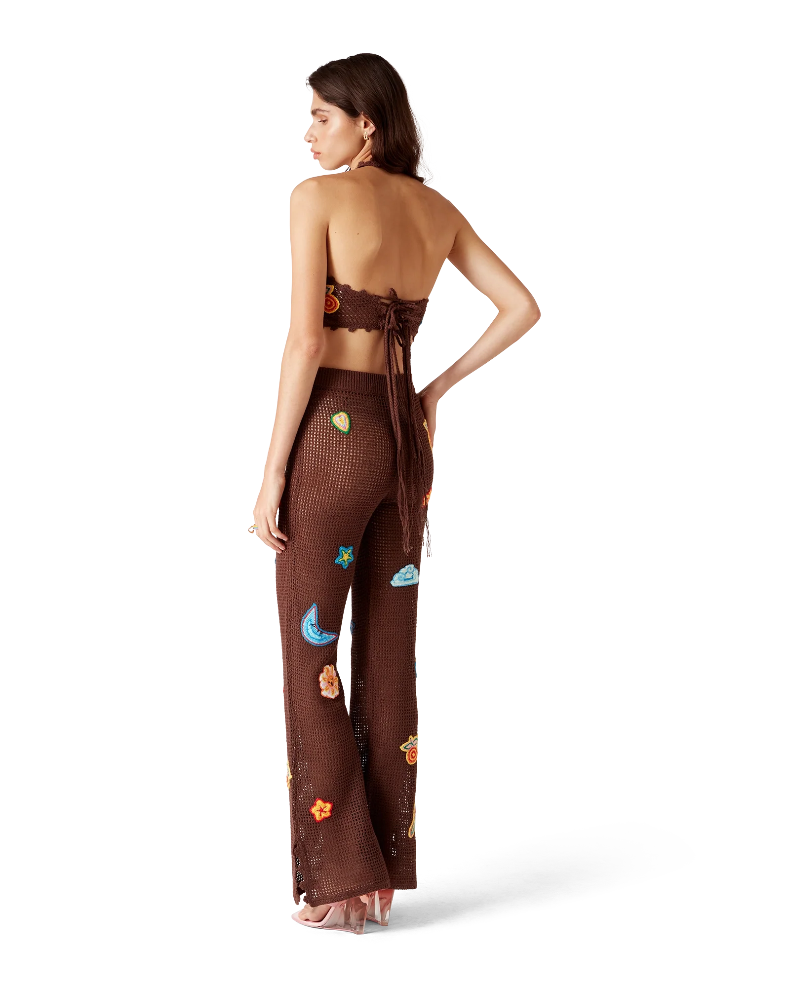The motif crochet crop top is a halter neck design crafted from an open-weave crochet cotton fabric. Completed with motifs of the house's classic design elements, and string fastening at the back. This piece is intended to be worn with its coordinating motif crochet trousers.